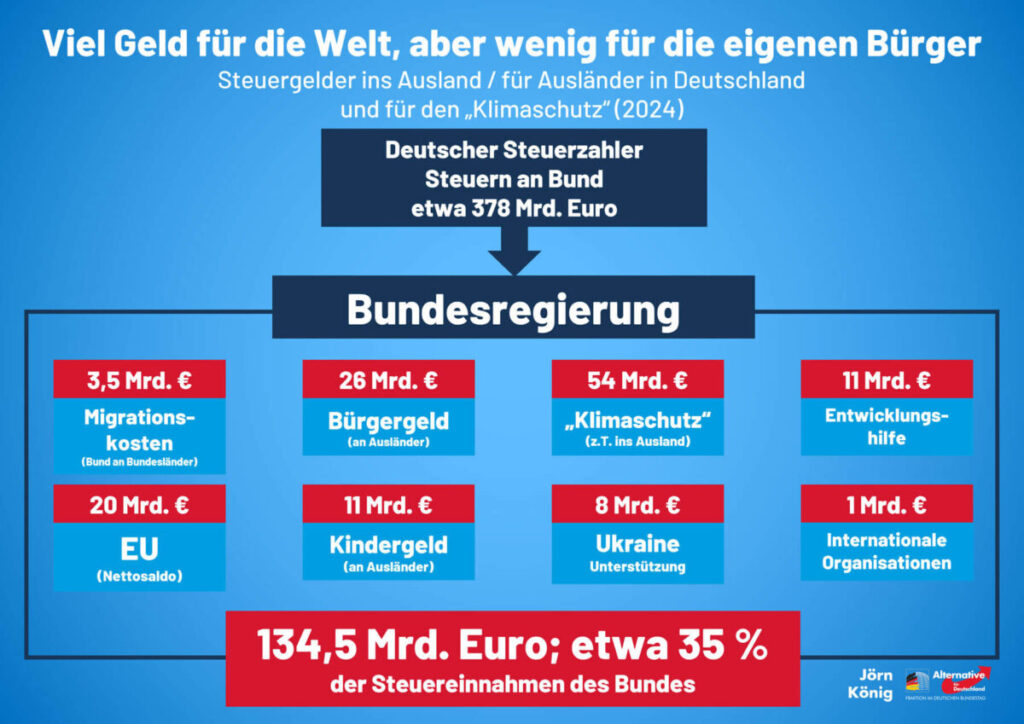 Rund 80 Mrd. € fließen jedes Jahr ins Ausland oder an Ausländer. 54 Mrd. € werden für den „Klimaschutz“ ausgegeben. Eine solche Fehlallokation ist Steuerverschwendung. Die Fokussierung auf die Kernaufgaben des Staates wie Sicherheit, Recht, Infrastruktur und Sozialsystem bei Entlastung der Nettosteuerzahler ist dringend geboten!