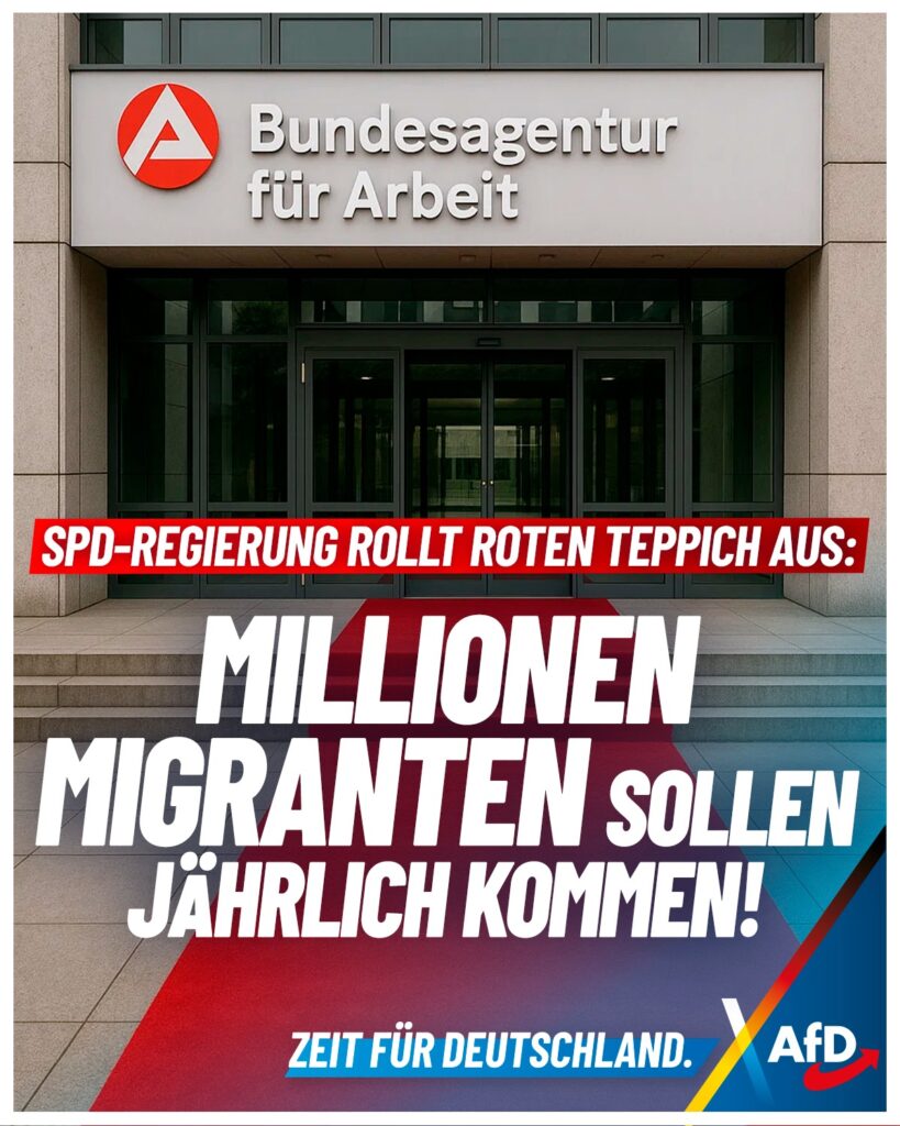 Die Bundesagentur für Arbeit der gescheiterten Ex-SPD-Chefin Andrea Nahles fordert Masseneinwanderung im großen Stil. „Wir werden alle Hebel nutzen müssen”, sagt Vorstandsmitglied Vanessa Ahuja und entwirft Schreckensszenarien. „Drastische Folgen” seien sonst zu befürchten: Firmenabwanderungen, Pflegekollaps und Zusammenbruch der Sozialkassen. Allein für 2025 fordert sie eine Zuwanderung von 1,7 Millionen Menschen. Hierzu sei eine neuerliche „Willkommenskultur” erforderlich.