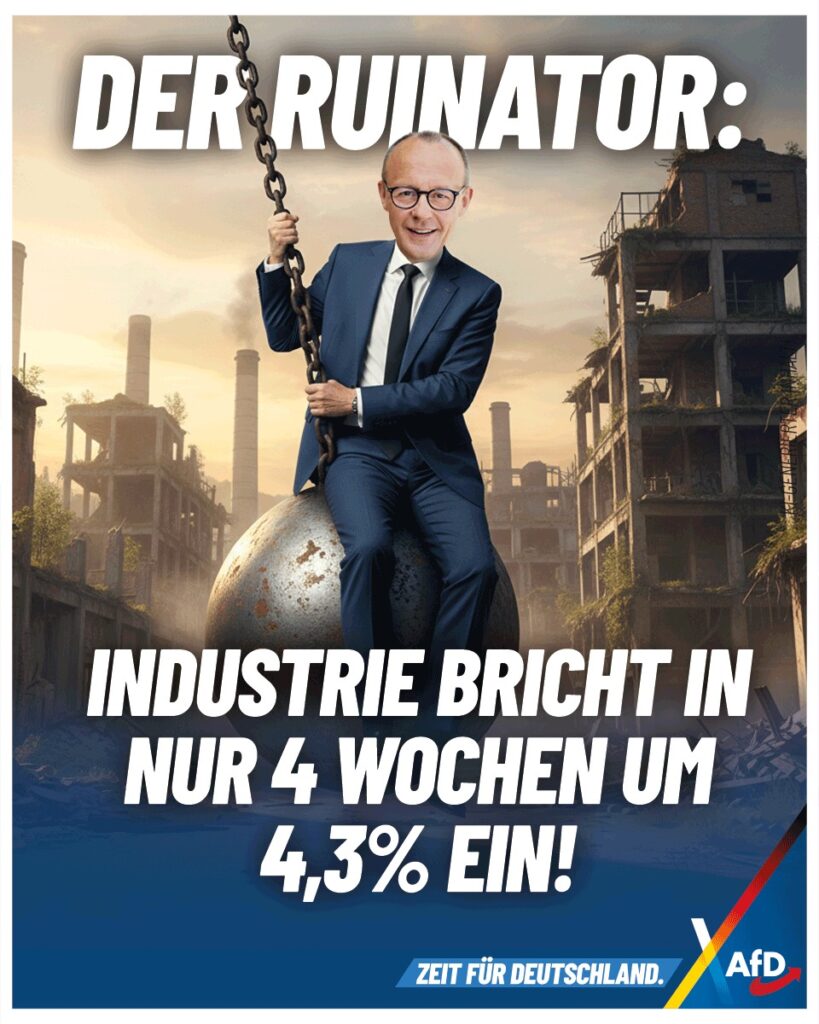 Die Zahlen sprechen eine klare Sprache: Deutschlands Industrie bricht im August um 4,3 Prozent ein – deutlich stärker, als Experten erwartet hatten. Produktion, Aufträge, Arbeitsplätze – alles schrumpft. Während Betriebe ums Überleben kämpfen und das Fundament unseres Wohlstands bröckelt, schaut die CDU-Regierung von Kanzler Merz tatenlos zu.