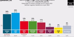 Kategorie: News / Pressemitteilung / Publikationen / Wahlen / Veröffentlicht am 13. August 202527. August 2025 von bhossack_ac4pzx9m Umfrage-Sensation: AfD überholt Union In der aktuellen Forsa-Umfrage (12. August) im Auftrag von RTL und n-tv liegt die AfD mit 26 Prozent erstmals seit Ende April wieder vor der Union. Gegenüber der letzten Erhebung …